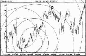 Одна ФИ-спираль вращается против часовой стрелки; другая направлена по часовой стрелке. Центры и отправные точки находятся в апреле и мае 2000 года. Обе ФИ-спирали пробиваются движением рынка акций Deutsche Bank на третьем и четвертомкольцах ФИ-спиралей. Исторический максимум в конце длинного и сильного восходящего тренда акций Deutsche Bank точно определяется пересечением обеих ФИ-спиралей в точке D.