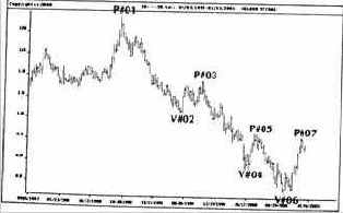 Рисунок 6.33 График наличной евро с сентября 1997 по январь 2001 гг. Важные пики и впадины Р#01 — Р#07.